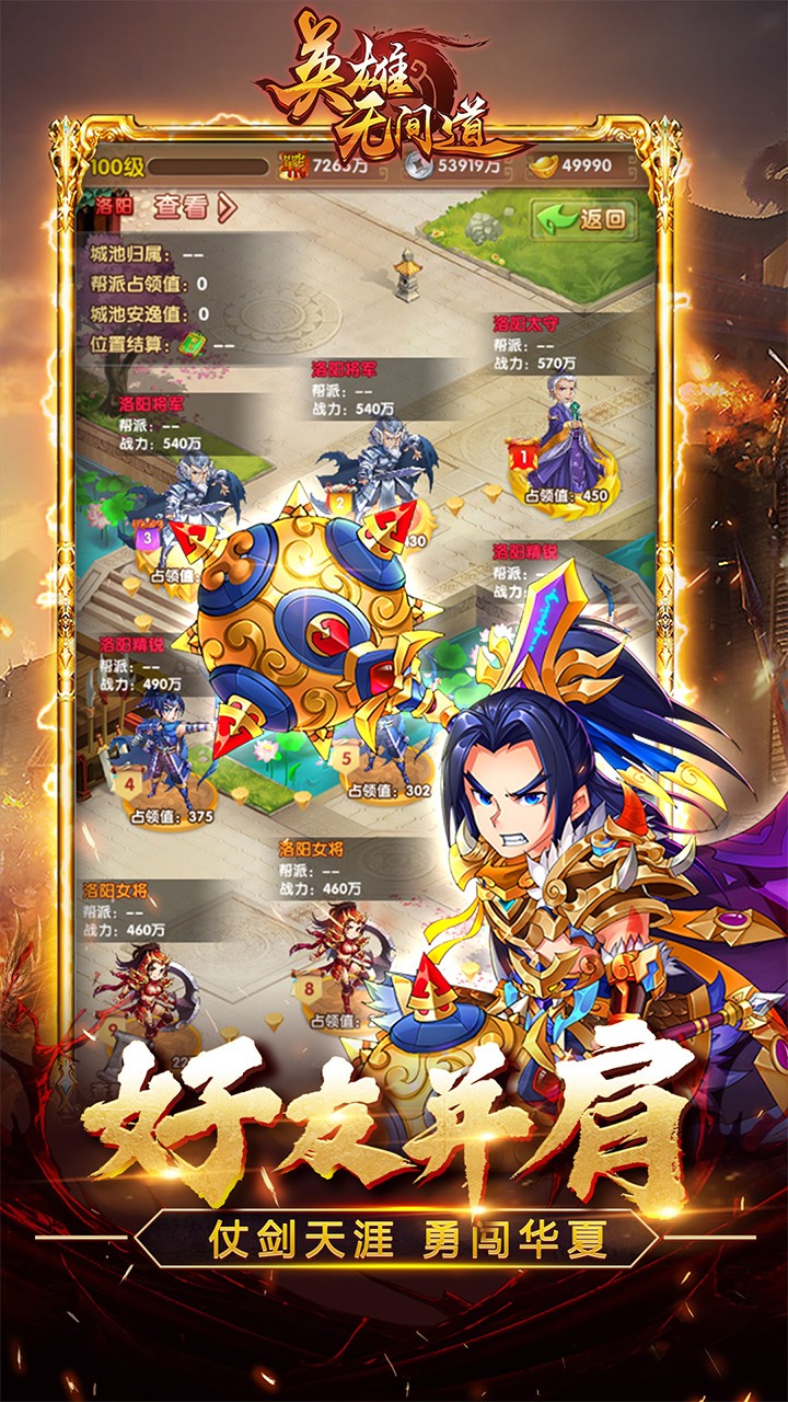 游戏角色选自历史中各大战役有名的武将,百位武将随意招募,带领玩家重温历史经典战役,感受精彩纷呈的战争艺术,各种副本等你挑战,还有强力装备,打造你的强力阵容,征战天下