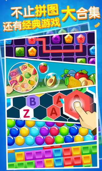 游戏拥有十一种拼图主题,十二种拼图难度,还拥有水果连连看、益智连线、合成到Z等小游戏