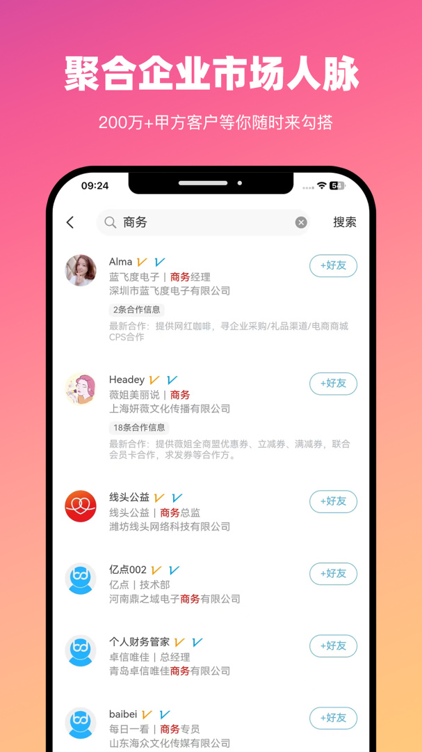 4、用户通过软件可以找到各种甲方资源,快速的合作获得更多资源