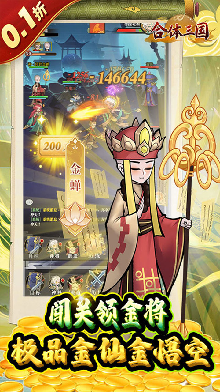合体三国折扣版主打武将养成和策略战斗玩法,操作轻松,画面华丽,剧毒神将随手可得,强力技能震撼全屏,丰富的福利活动和超高倍率返利让您玩的舒心,与全服玩家皇城pk,看看谁是最优秀的统帅吧