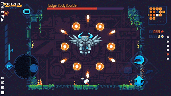 游戏在敌人方面的设计,也辅佐了这爽快的战斗体验,每个场景内敌人的站位基本都经过了考量,来确保玩家的“飞行”体验,且各敌人的特点也很鲜明,不同的攻击方式需要玩家运用不同的策略来应对,大部分敌人“弹幕”式的攻击,也向玩家的反应力提出了考验。而BOSS战这个Roguelike中比较重要的元素,游戏给我的体验同样不错,五个差异化明显的BOSS皆有着巨大的身躯,且各自都有丰富的招式和不同阶段,具有压迫感的同时,也给了我充足的挑战