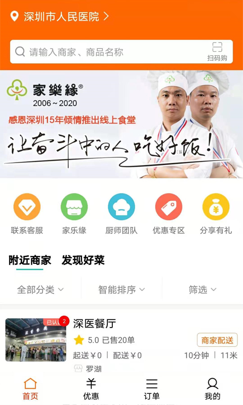 1、打开软件进入首页,系统自动定位你的所在地,给你呈现离你最近的食堂;
