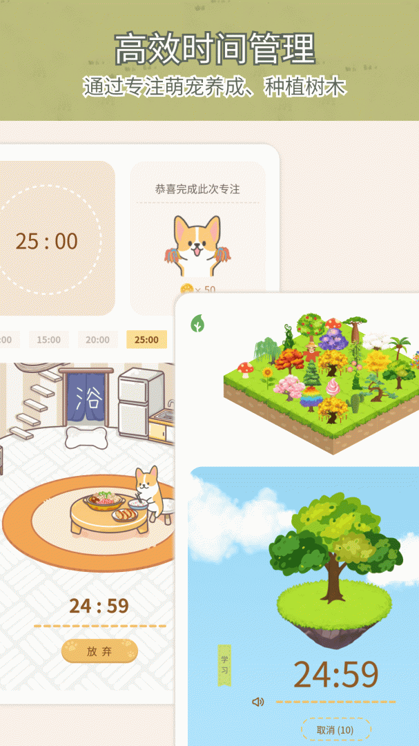 当你进行专注时,萌宠也会相应成长,在提升时间管理、培养高效率学习工作习惯的同时和萌宠一起成长吧