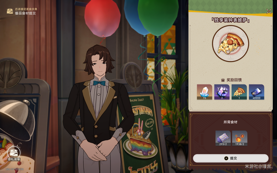 按要求提交相应食材后会获得70星琼(果然是变废为宝,好耶 ),3个漫游指南(角色升级材料),1个钟表披萨(单片)(单片不够塞牙缝的)和40000信用点。这样第6天的美食「独享装钟表披萨」就完成啦!