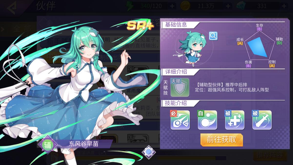 接下来这个伙伴组合具有非常强的控制和属性技能,整体上收集也比较容易。在对战时雾雨魔理沙具有一定的降敌和防御技能,东风谷早苗属于控制系的伙伴,可以打乱对手的阵型,再加上其他伙伴的攻击,让你在后期轻松闯关。
