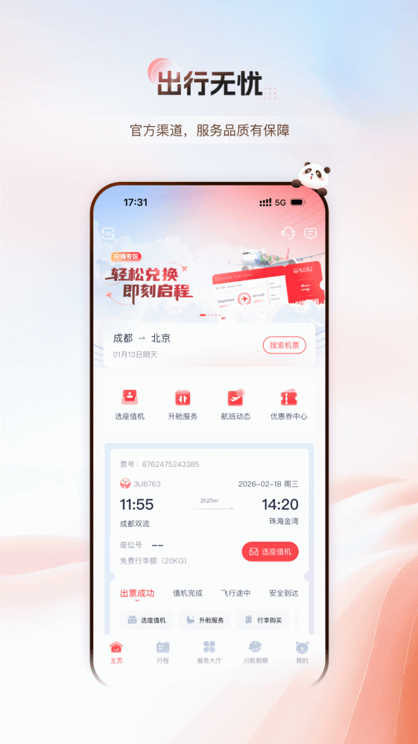 四川航空是一款提供航班查询、机票预订和值机办理等服务的手机应用,用户可以通过四川航空app随时随地查询航班信息,选择心仪的航班并在线购买机票,用户还可以在app中进行在线值机、选座等操作,方便快捷,四川航空app界面简洁友好,操作便捷流畅,为用户提供了全方位的航空服务,让您出行更加便利和舒适。
