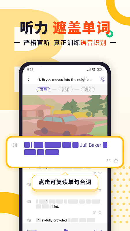3、还有大量的原声听力练习,各种等级难度,融入一个真实的交流对话