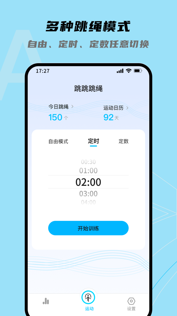 2、可以选择自由模式、定时、定数跳绳 ,运动量可以根据自己的需求进行设置,增加你的跳绳兴趣,一起坚持跳绳运动
