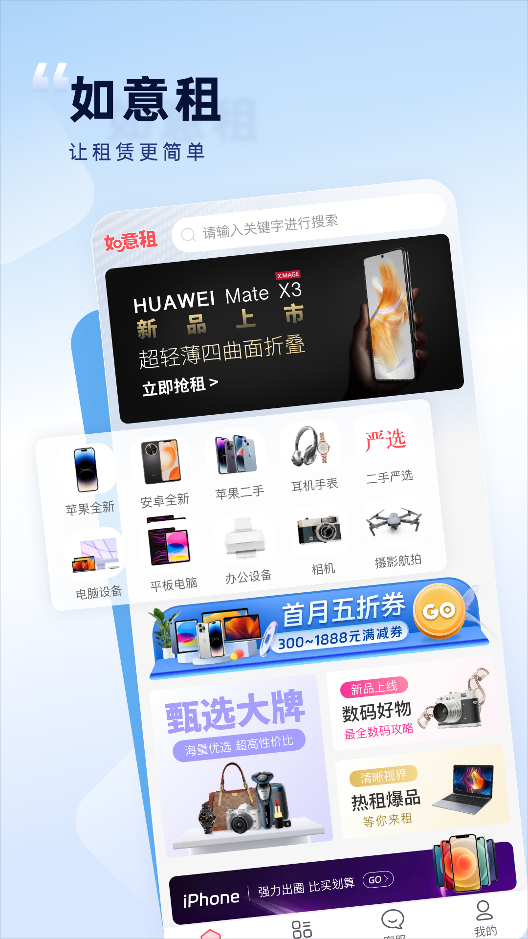 如意租,一个非常实用的数码产品租赁平台,用户们生活中的数码产品在这个平台上面基本上都有,且无需购买,可以直接在平台上面租赁,提前使用。软件支持线上租赁,线上支付租赁款项,这里面的数码产品都是即租即用的,用户们完全可以在软件上面体验过智能手机之后再考虑自己要不要购买