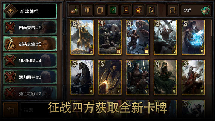 游戏拥有大量经典《巫师》系列中的角色和场景,让玩家可以感受到原著的丰富背景故事和深厚的情感连结,玩家可通过收集不同的卡牌,打造自己的强力卡组,展开刺激的对局挑战。