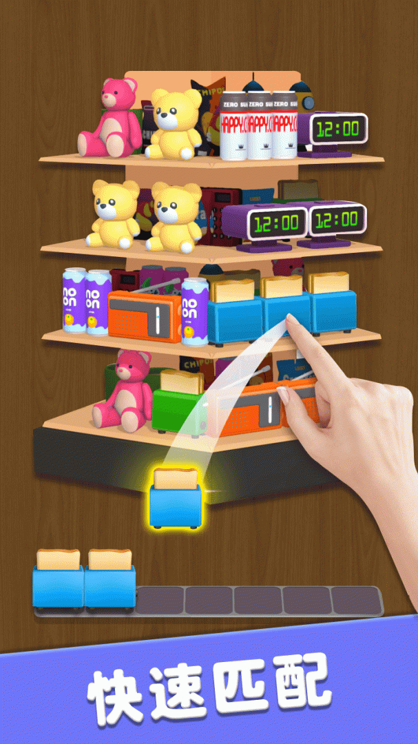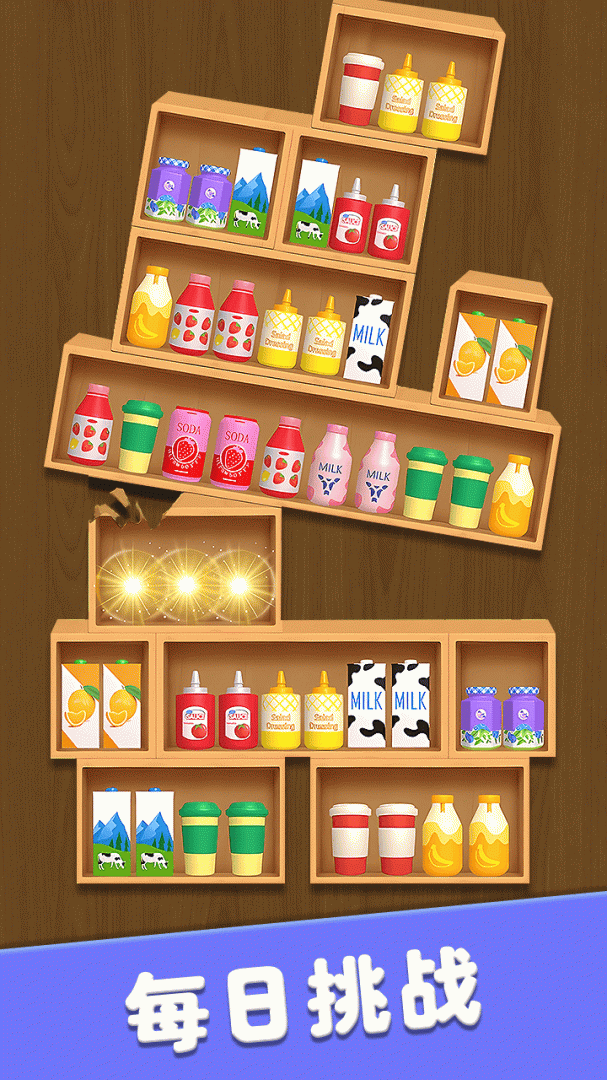 只需将相同的物品移动到货架上,消除容器上的正方形,玩家只需将相同的项目放在一起即可解决。游戏提供了许多道具和特殊的方块,你就可以获得很多奖励来完成关卡任务