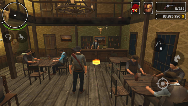 小镇中有很多房屋,有一些房屋门口有光圈,是可以进去的,不过得先下马才行。从左上角的小地图中可以看到一些标记,五角星代表警察局,手枪代表武器商店,酒杯代表酒馆,另外绿色的房子,代表小镇中的空房,我们如果有钱可以购买。