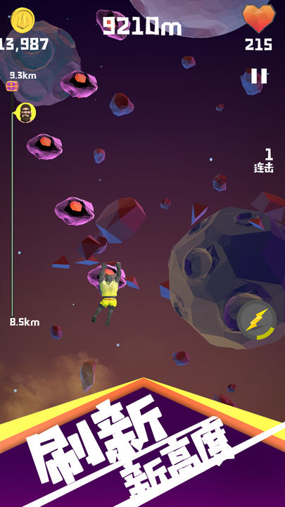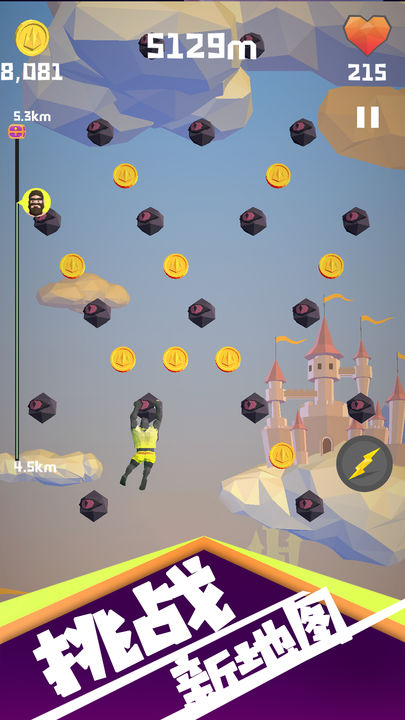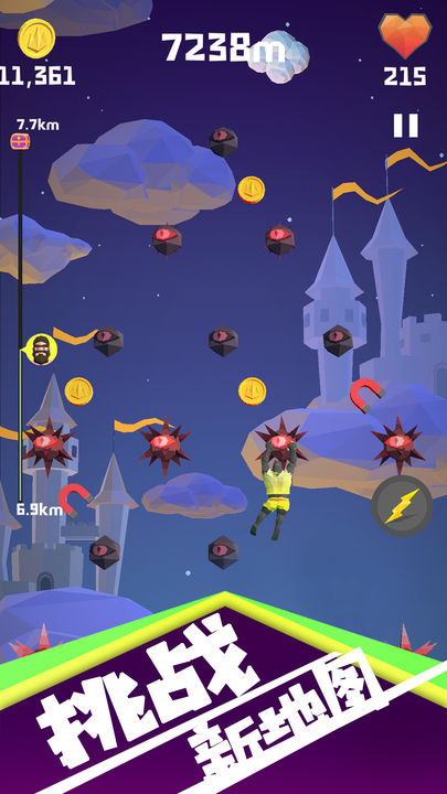 游戏玩法简单,玩家需要操控游戏角色来进行攀爬跑酷,需要不断往上前行,游戏过程中会有很多阻碍需要躲避,还有海量金币可以获取,游戏难度递增,还有各种游戏道具可以辅助