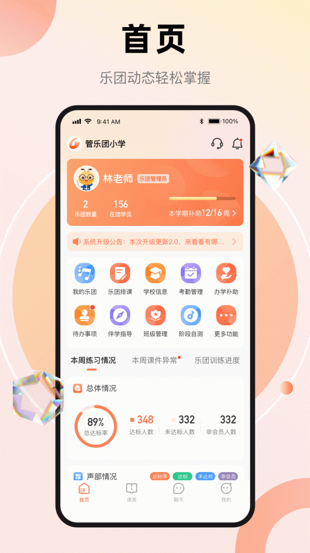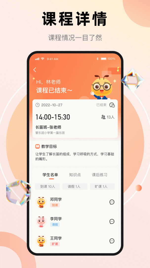 通过管乐团管理端 app,可以很容易地进行教学,它有详细的课程安排,对课程管理有清晰的了解,还可以在线查看学生的上课情况,十分方便