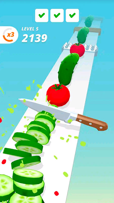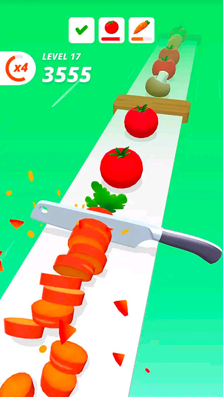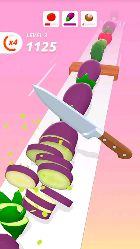 3、控制案板上的刀去切蔬菜,左上方还有关卡进度提示,可根据提示进行游戏。