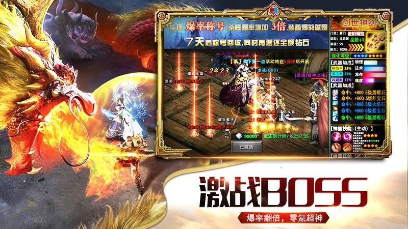 4、百倍爆率福利地图免费进入,最高可达百倍爆率。所有怪物均有几率掉落终极装备,小怪也能爆神装