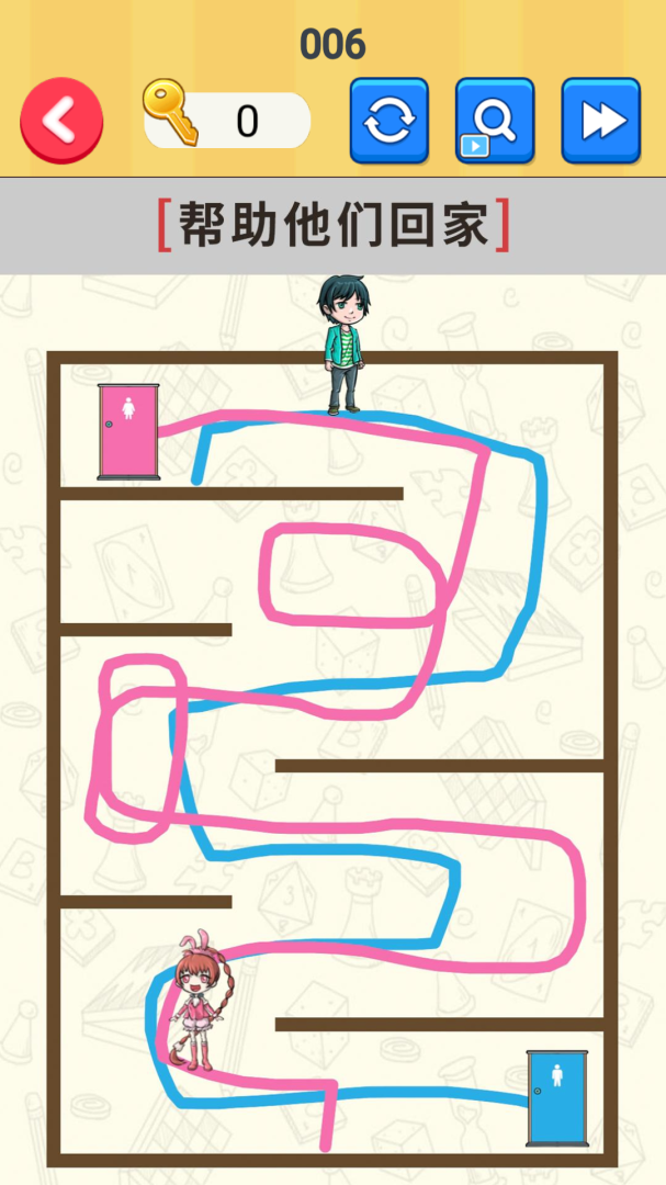 游戏以独特的连线机制为核心玩法,玩家需要通过连接相同颜色的点或线段,帮助角色们找到回家的路。每个关卡都有不同的障碍,玩家需要仔细规划每一步,确保连接线不与其他线路交叉,才能成功过关