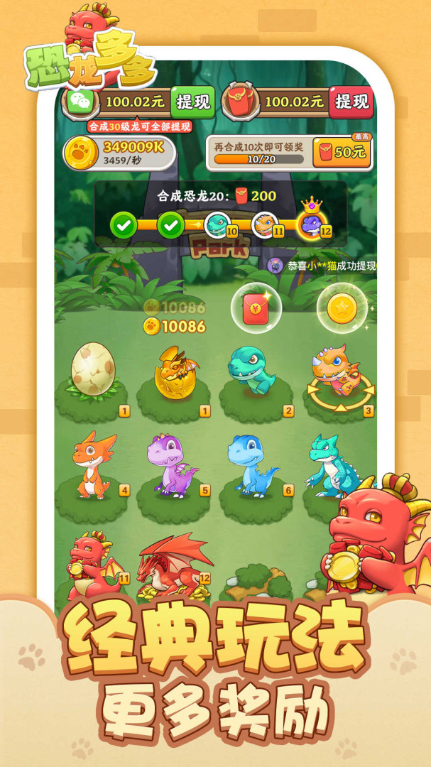 恐龙多多游戏中,玩家需要通过合成不同种类的恐龙来创造更强大、更独特的恐龙。玩家在游戏中完成特定任务或达成里程碑后,可以获得红包奖励。这些红包可以是虚拟货币、游戏内物品或优惠券等。玩家可以通过游戏内的社交功能向好友发送红包,增加游戏的社交元素。鼓励玩家邀请真实生活中的朋友加入游戏