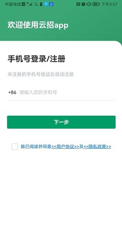 打开云招APP,选择注册账号,填写手机号码并获取验证码,填写个人信息完成注册。