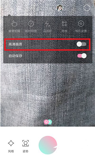 3、点击后会在顶部出现拍照设置的界面,找到【高清画质】选项,默认的是关闭的,点击打开后方的选项;