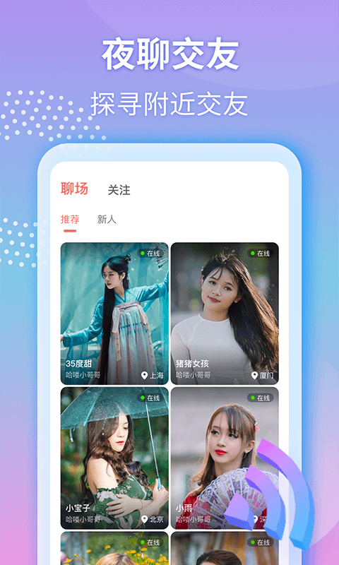 夜聊是一款社交软件,主要提供用户在线交流、分享生活、结识新朋友等功能。