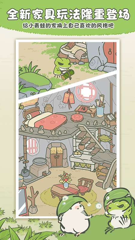 游戏以轻松愉快的氛围为主,让玩家摆脱现实压力,通过养护小青蛙、打理花园等活动放松心情,提升幸福感。