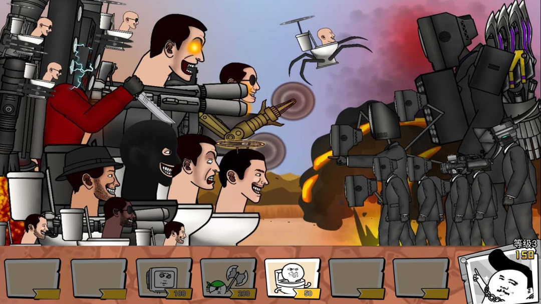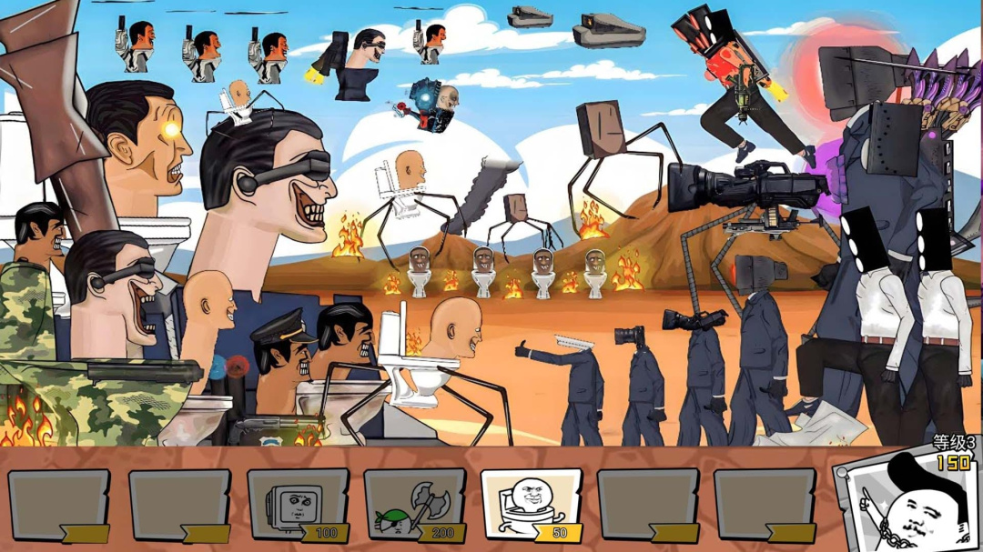 《马桶人逆袭战争》是一款具有创意和幽默的塔防游戏,在游戏中,玩家需要扮演勇敢的马桶人,抵御来袭的敌人,并夺回被侵占的领土,通过设置各类独特的防御塔和陷阱,玩家要精心部署防线,阻止敌人的进攻,游戏设定多样化的场景和关卡,挑战玩家的战术规划和反应能力,游戏还提供丰富的升级系统和技能树,让玩家能够不断强化自己的马桶人和防御装备,快来带领马桶人与敌人展开逆袭之战,保卫家园!