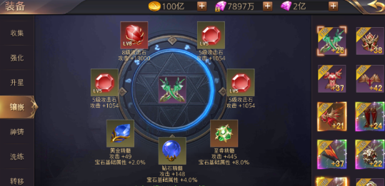装备可以给玩家提供大量战力加成,品质和星级越高加的战力越多,玩家还可以通过镶嵌宝石来强化装备。锻造需要消费金币,提升少量战斗力,镶嵌宝石按宝石品质给玩家提供不同的战力以及属性加成,宝石级别越高提升属性以及战力越多。