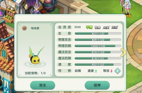召唤出的宠物资质是随机的,可以尝试多召唤几次,不想要的宠物可以直接选择放生,放生会返还大量骨头饼干哦,非常划算的呢!然后选出自己心仪的宠物一起战斗吧~