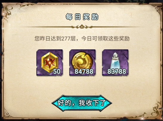 冒险玩法中的无尽幻塔,每天会根据已通关层数给予奖励(少量获取金币)