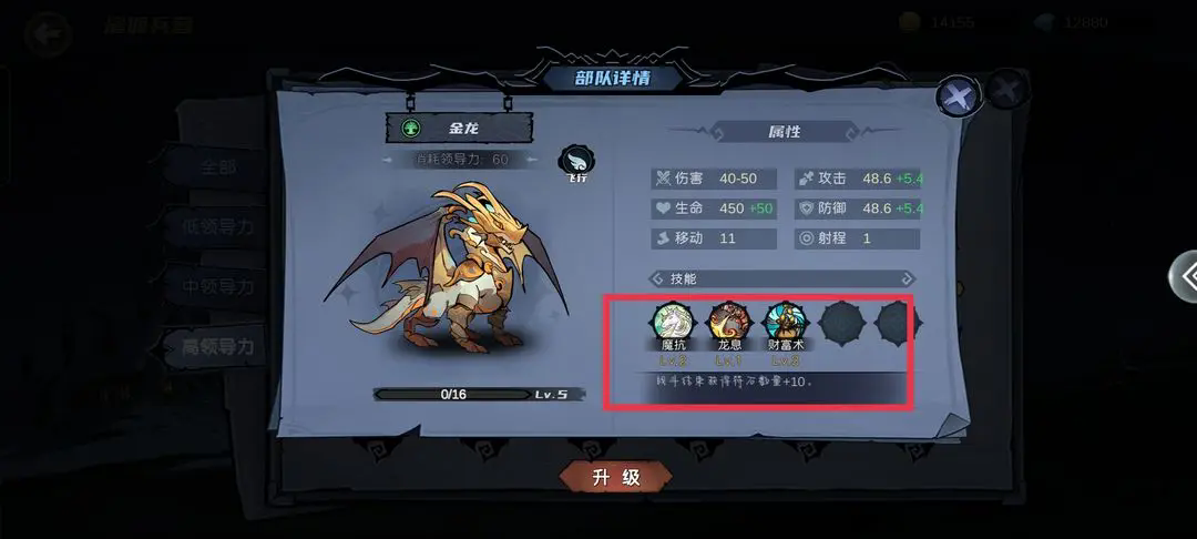 5级的金龙是个好东西,每次战斗额外获得10符石,并且龙息可以攻击一排,横竖都可以,非常好用。钻石多可以考虑买金币抽出来,我两个号大概都在8000钻左右出的。后面不需要带黑魔法了,泰坦+独眼两远程足够,毕竟后面基本都是靠黑兵打伤害。而且局内黑之术+配黑暗序曲升到三级,就可以变成黑魔法。