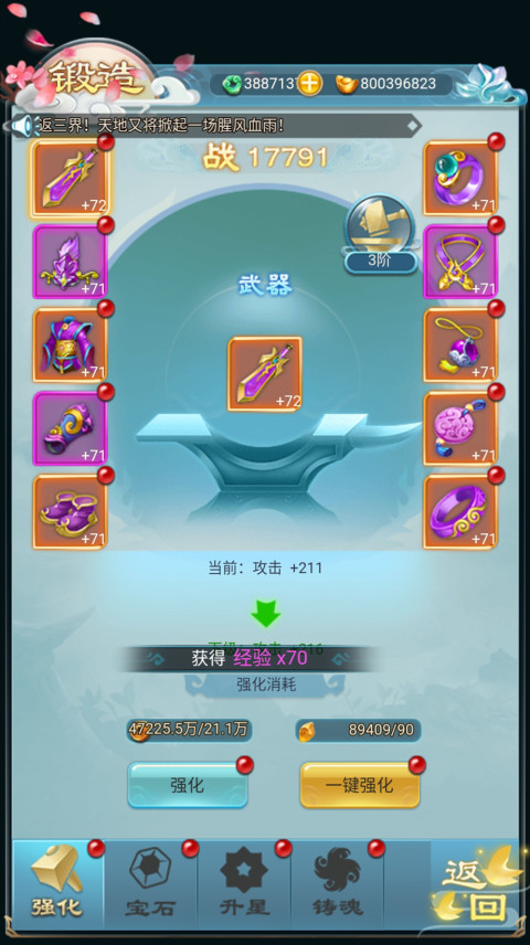 强化:强化就是游戏中常说的“加几”,且《少年封神》中的强化有“强化大师”的特殊加成,当身上的所有装备达到某一阶时可以获得额外的属性加成。强化消耗铜钱和强化石,通过挂机副本、熔炼装备以及日常任务都可以获得大量强化石和铜钱。也可以到商城中用铜钱购买强化石。