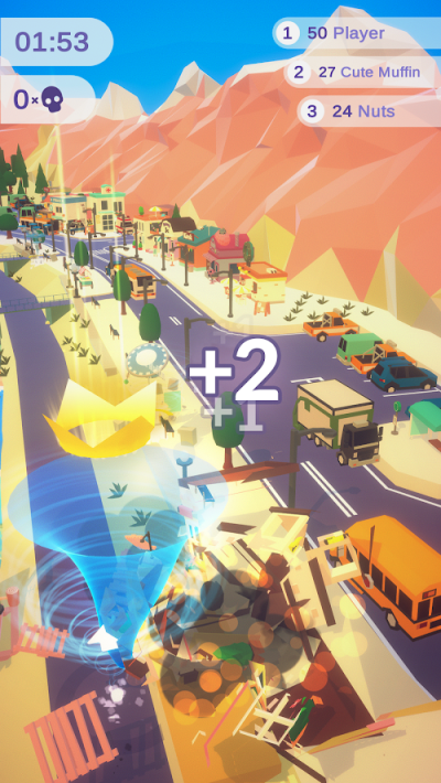 《城市破坏大作战》是一款模拟风暴破坏的IO游戏。在旋风破坏大作战手游中,玩家要控制一个风暴在城市之间肆意破坏,尽可能破坏更多的房屋,获得更多分数。你还会和全世界的玩家一起竞技,在规定的时间内进行比赛,分数最高的玩家将获得胜利。