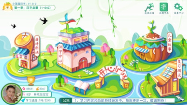 小笨猫识字,轻松学汉字,幼儿学唐诗,小学无压力,幼小衔接学习软件。贴合2-8岁儿童的认知发展规律,根据儿童发展心理学,结合儿童脑,我们细分年龄,整套软件分为四季,总共学习3240个汉字,包含了小学一至六年所有生学。