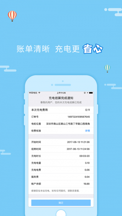 清晰可见的电费信息显示,实时的订单结算详情推送,便于更好的查看;
