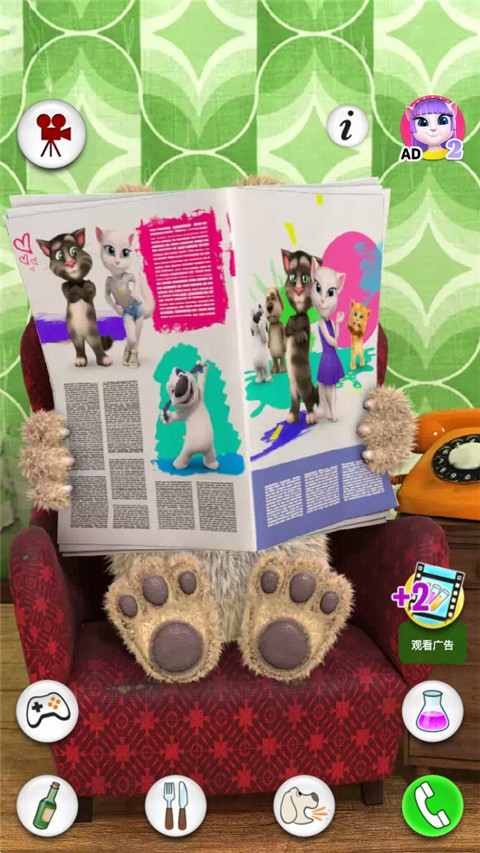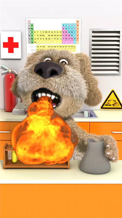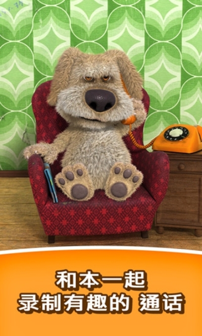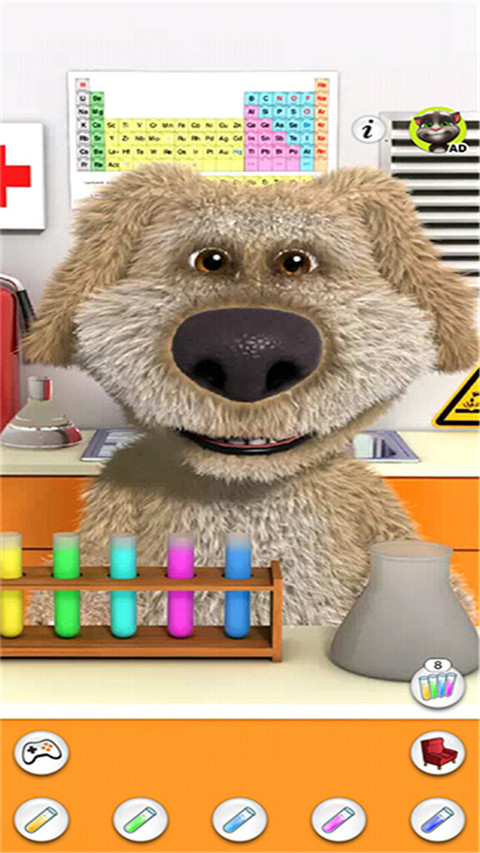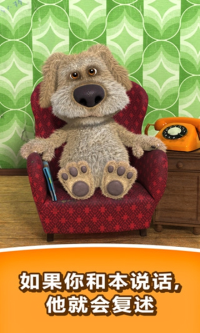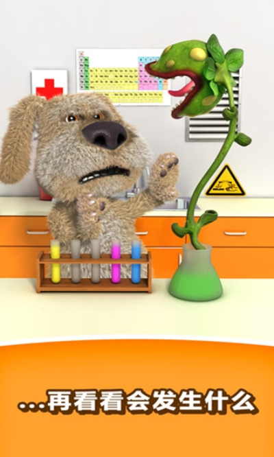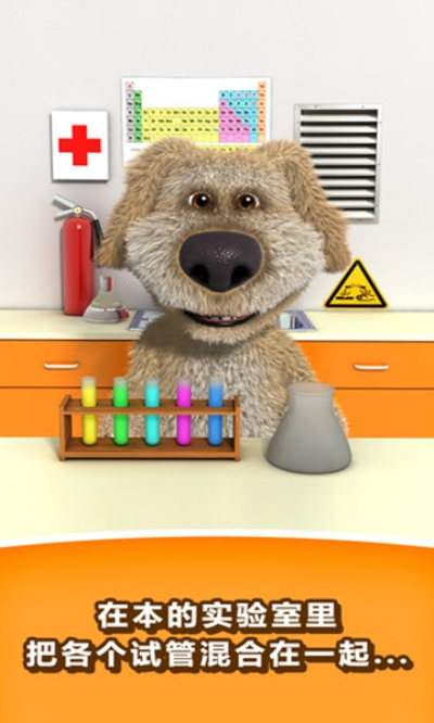 在《会说话的狗狗本 Talking Ben the Dog》游戏中,本是一名退休的化学教授,他很享受品尝美食、美酒和阅读报纸的宁静舒适生活。要使他做出反应,你需要烦扰他足够长的时间,这样他就会合上手中的报纸。这样,你就可以和他交谈,用手指戳他或给他挠痒痒,甚至跟他电话交流。如果你把本带到实验室,他就会欢呼雀跃。在那里,你可以通过把两支试管混合在一起做化学试验,观察各种神奇的反应。