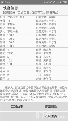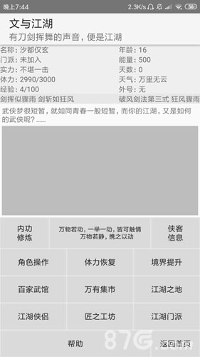 对于文字类的武侠游戏我是很支持的,这个游戏我也很支持,但试玩了一下,感觉就很懵,首先开始是界面上的选项意思我还是一个个试了才知道是什么作用,真的除了第一个我一下子都没看懂。