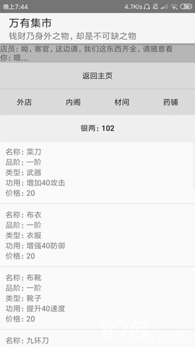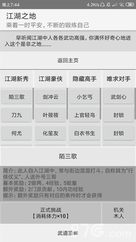 画风简约,但是觉得有很多功能都很鸡助……一开始真的是很懵,后来慢慢瞎点,买了几件装备后就去刷江湖了,好不容易刷了500点门派贡献!!!!结果来个bug!!!我点了学武功后,在纠结选哪一个武功,然后给摁退出了!再打开的时候,我贡献没了!!!!武功也没学成!!!!好气呀!!!!