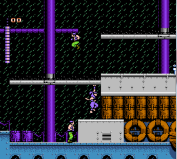 游戏讲述了在未来美国废土,蓝衣忍者Hayate(疾风)与红衣忍者Kaede(枫)联合击败邪恶加尔达王的故事。除了标配的忍刀,你的忍者还能使用镰刀,它的攻击范围更大,但近战吃亏。此外,还有数量有限的忍者镖与炸弹。你还拥有一套能够击中屏幕上所有敌兵的费血大招。不幸的是,大部分敌人都不是一两下能杀得死的,因此这招费血技的效果有时并不明显。