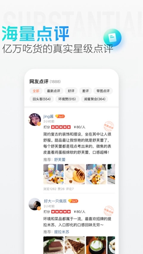 吃喝玩乐的必备神器!现在下载 dianping ,随时随地订座、订餐、指南、开房、点评团、美甲、攻略、保洁、密室逃脱、精致美食、spa、休闲、购物、夜宵、小龙虾、火锅、电影、美发、还有婚纱、摄影、钟点房、购物、优惠套餐、美食套餐、电影票抢购、外卖、旅游、游泳、健身、网上购物、9块9两张电影票、保健、中国、聚餐、商城、午晚餐、宠物、化妆品、3d电影、停车场、社区、各个业务与产品任您选! 吃喝玩乐上大众点评,出国不用愁的吃货必备神器,同时支持微信、支付宝支付!