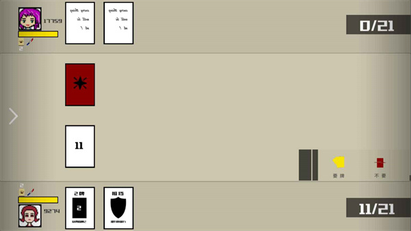 数牌牌组为1---11,玩家要尽量使自己的点数 靠近 最大点数,同时不能超过最大点数,在运气不好的时候,合理使用王牌来化险为夷。