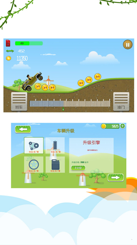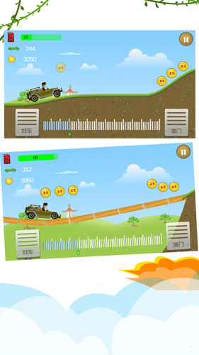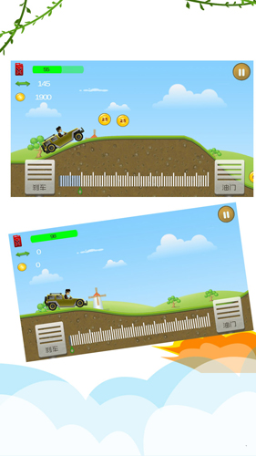 1、操作飞车的方法也很简单,通过控制手机的屏幕上左右两边按钮来控制登山车的开车速度和方向。
