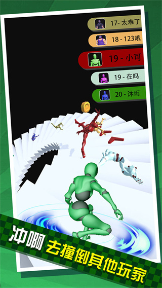《给我滚下去》是一款以经典的io题材为主的多人休闲闯关游戏。玩家将操作自己的小人同其他玩家一起挑战滚楼梯,率先能够滚到终点的玩家即为胜者,当然这个滚的过程中,玩家间也是可以互相干扰,比比看谁最会滚楼梯吧。快来下载试玩吧!