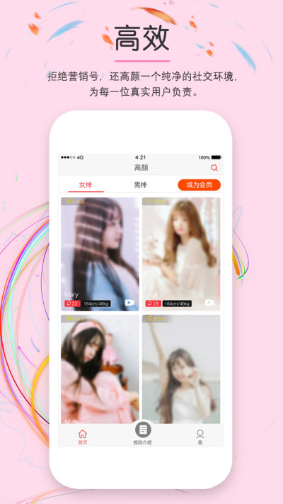高颜,高颜值高效率高品质社交平台。针对单身成功男士 和 高颜值女生 的专业牵线平台。高颜是一款专注于精英人士的移动社交应用,让你在都市繁忙的工作和快节奏的生活中快速邂逅那个TA。一切的美好都将成为现实,只要心中有梦,就有实现的可能。愿每一位成功男士都能找到喜欢的她,愿每一位魅力女生都能遇见心仪的他。高颜让高端社交变得简单,让高端社交变得高效,让精英人士有足够的时间去享受生活,享受美好,享受幸福。