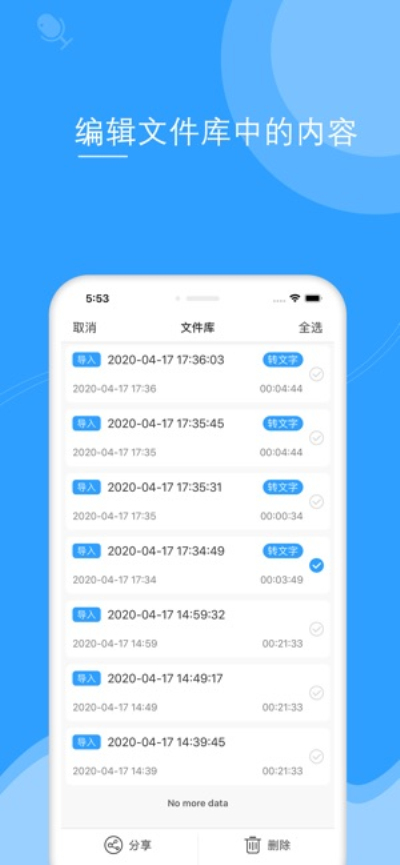 #将保存的文件记录在文件库中,提供保存录音音频,识别文本,可将文档分享至微信、QQ等社交软件,支持文档管理,分享格式。