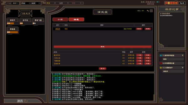 游戏提供了多种不同等级的武学(将不断添加),你可以在游历过程中通过任务、解谜甚至偷盗等方式获得。不同的武学对修炼者的天性和天赋有不同要求,你可以选择合适的武学搭配来提升弟子的战斗力。
