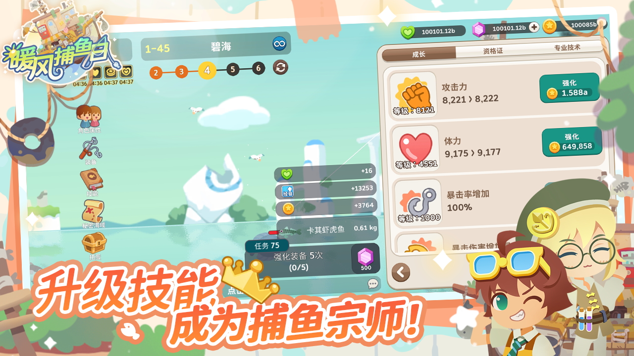通过捕捉更大的鱼儿来提升自己的能力,并升级你的钓具,以迎接更强大的挑战!装备,属性提升,技能提升……超多养成线,满足你的成长需求!