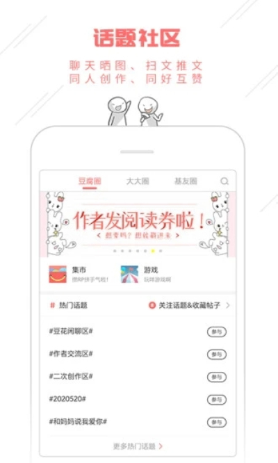 耽美、言情、穿越、娱乐圈、校园青春、悬疑推理、架空玄幻、游戏竞技、修仙、古风、甜宠虐恋等不同类型的原创或同人小说漫画每天看。