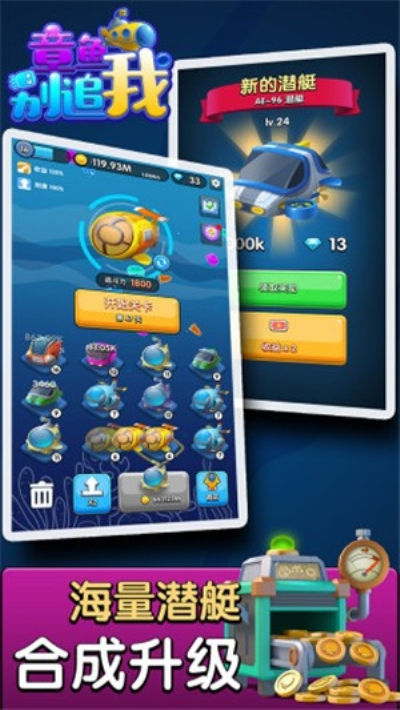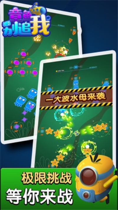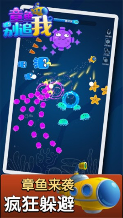 《章鱼别追我》是一款题材新颖的休闲闯关游戏。游戏的画风非常的精致,玩法也是非常有趣,在游戏中我们需要通过合成同等级的潜水艇来升级,通过升级潜水艇来解锁更多潜水艇功能,更有丰富的子弹和大炮任你使用,随时准备着消灭眼前看见的所有章鱼和乌贼。