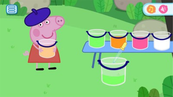 3 - 混合色佩奇有油漆的桶,帮助Peppi创建完全相同的颜色。你必须混合的颜色。添加额外的油漆空桶,混合的颜色,看看颜色,你得到的。有趣的教育迷你游戏的孩子中,孩子学会通过混合不同的颜色来创造所需的颜色。